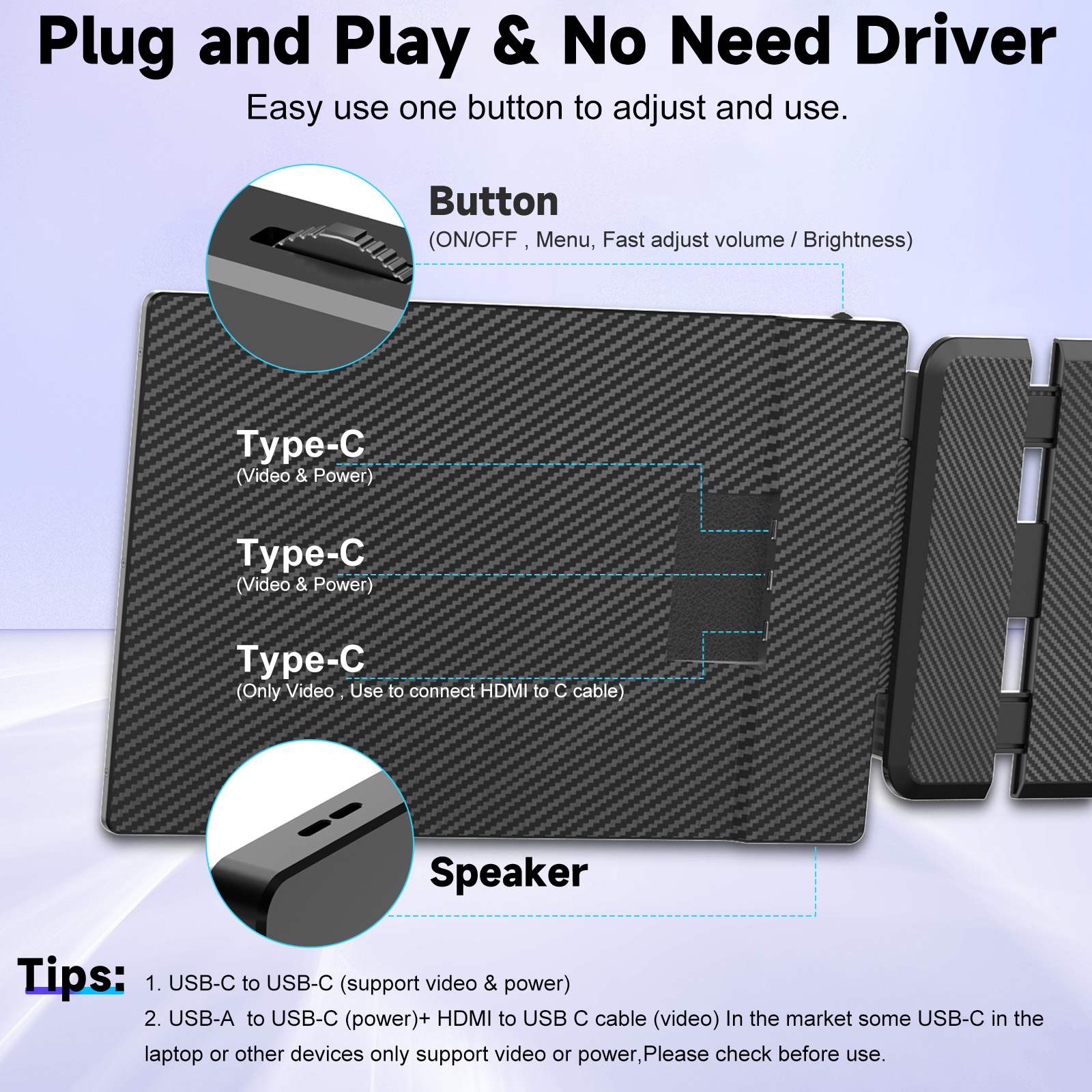 Generally, this happens because the screen is only connected to the Type-C cable, but the USB-C port of the laptop only supports the power supply function(not full-featured) and not the video signal function, so you only need to use the included HDMI to USB-C cable to connect to the portable screen to provide a video signal.